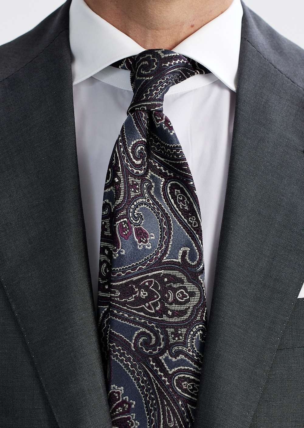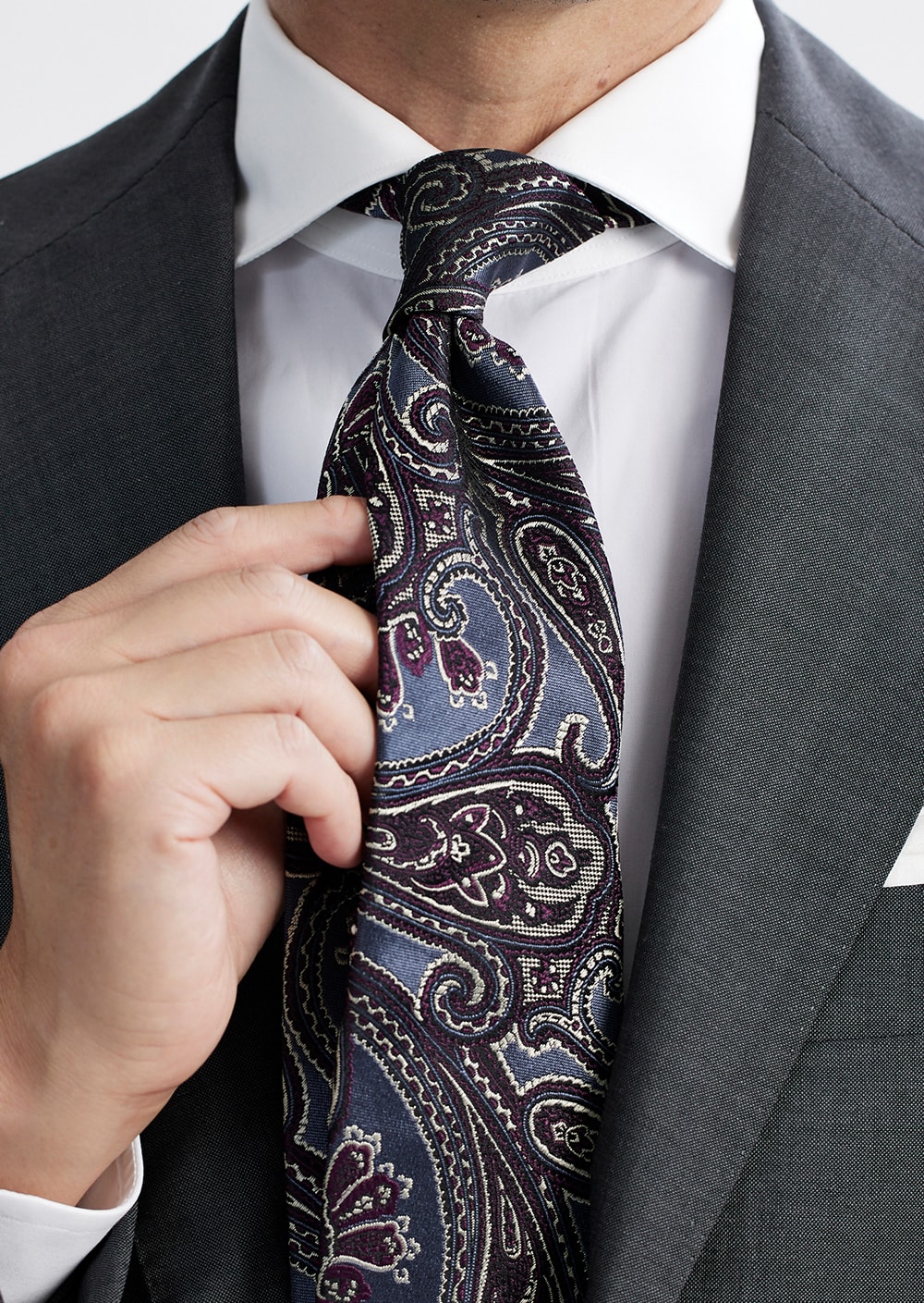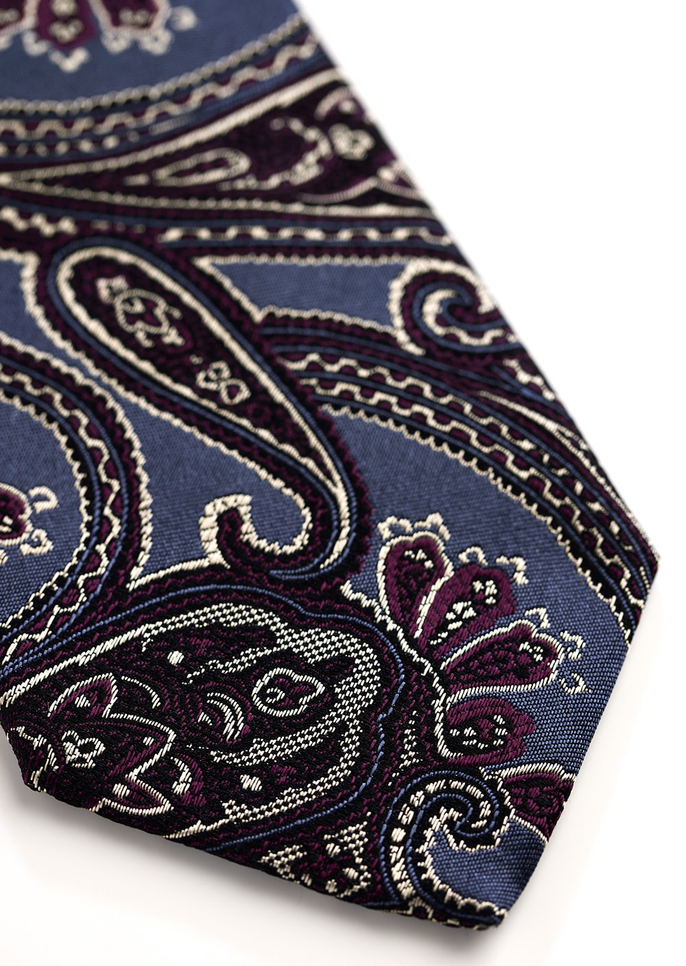 美しいサックスブルーを基調に、パープル、シルバーを差し色にデザインされた大柄ペイズリー。 サテンにバスケットの織り柄の変化も特徴的なフランコバッシならでは魅力を感じる1本です。