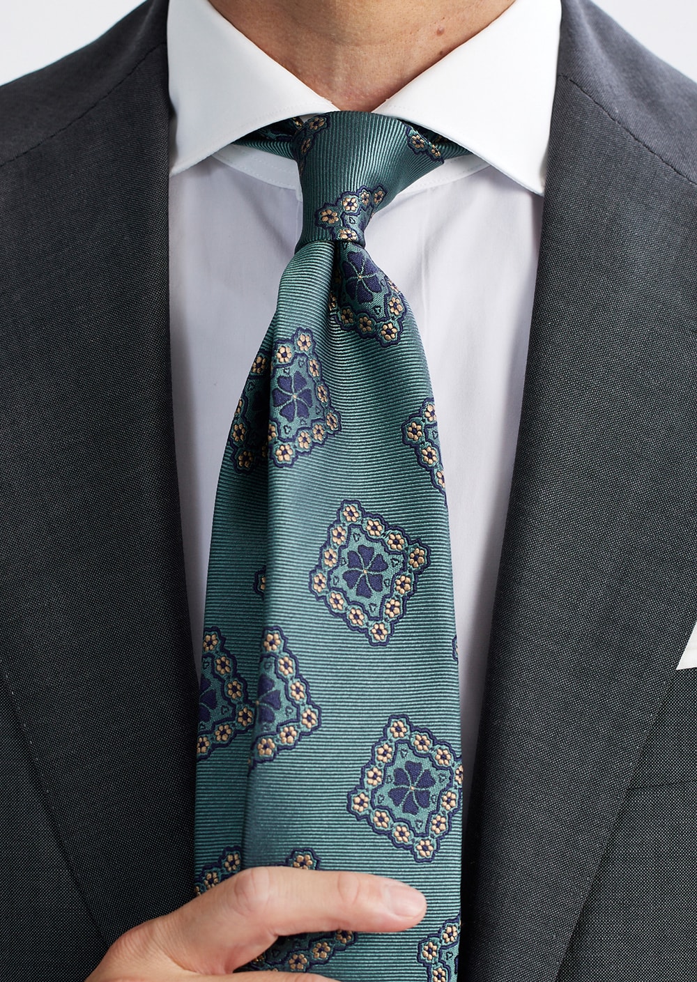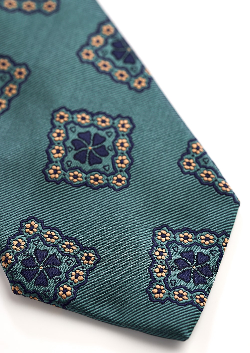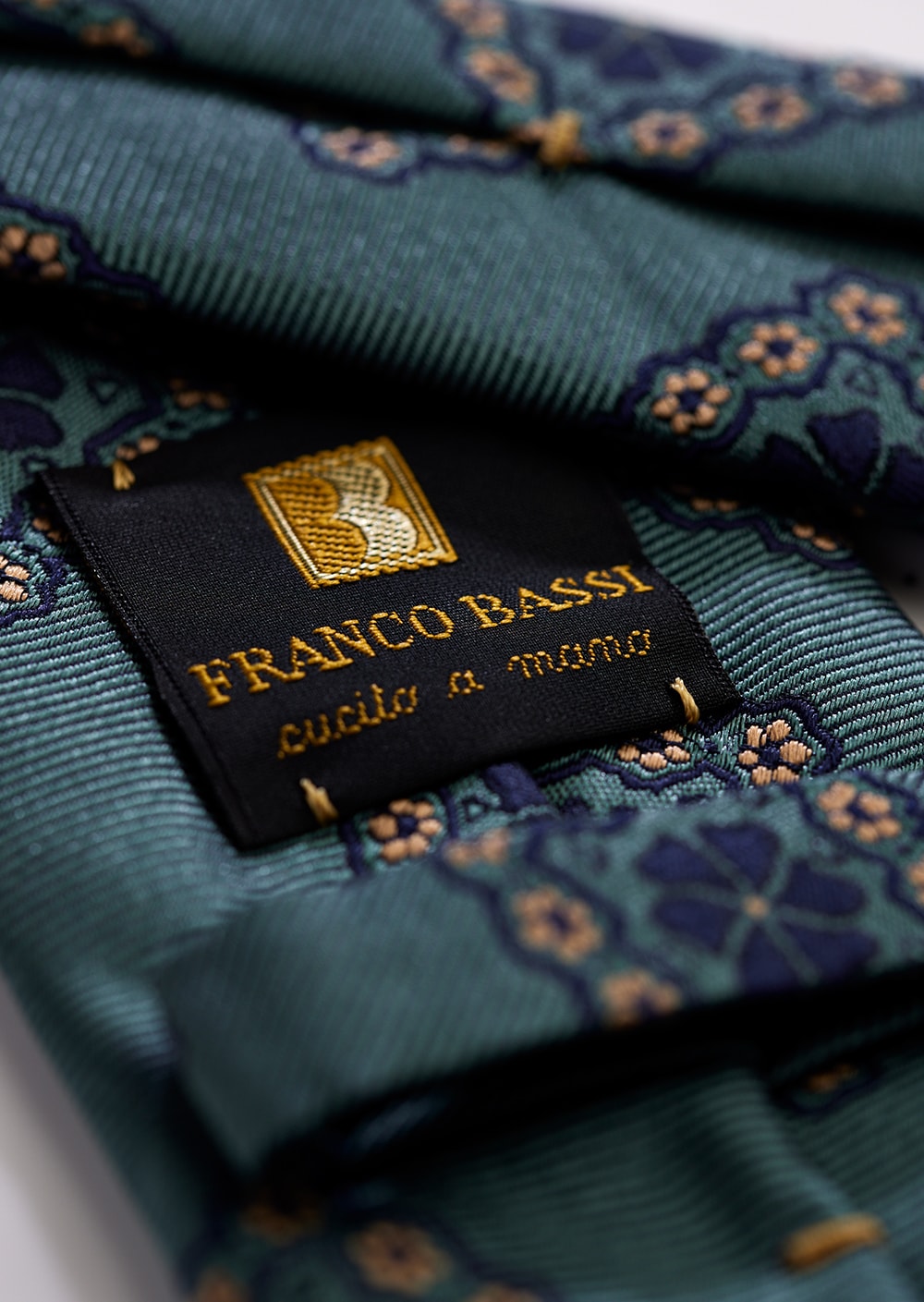 落ち着きのある中間色のグリーンはなかなか出会うことがなく、特別な印象を感じます。 大柄をバランスよく散らしたインポートらしさを強く感じるデザイン。 フランコバッシならではの魅力を感じる1本です。