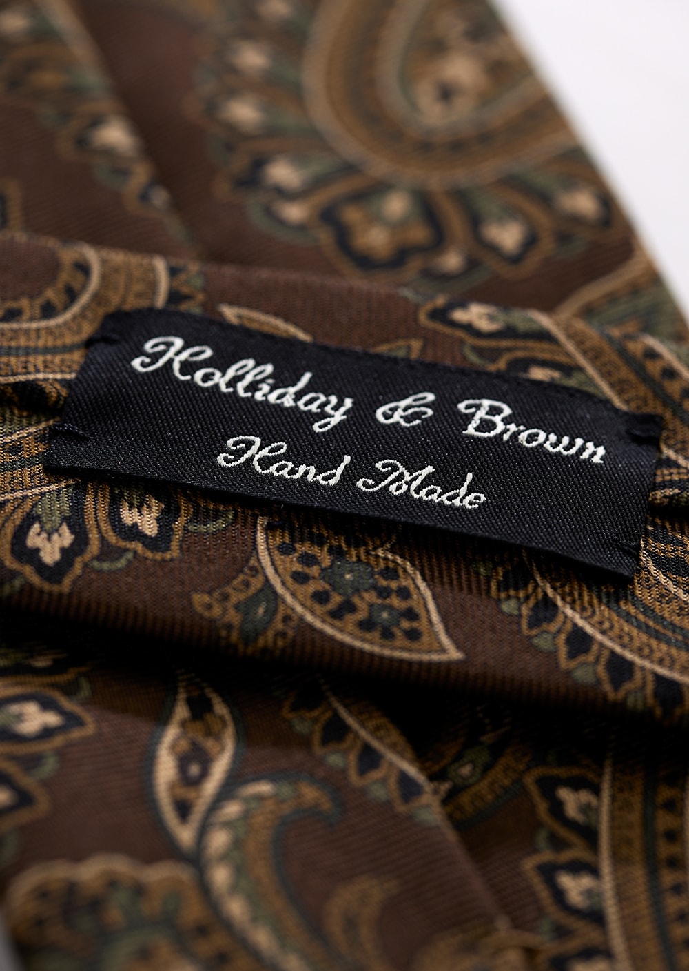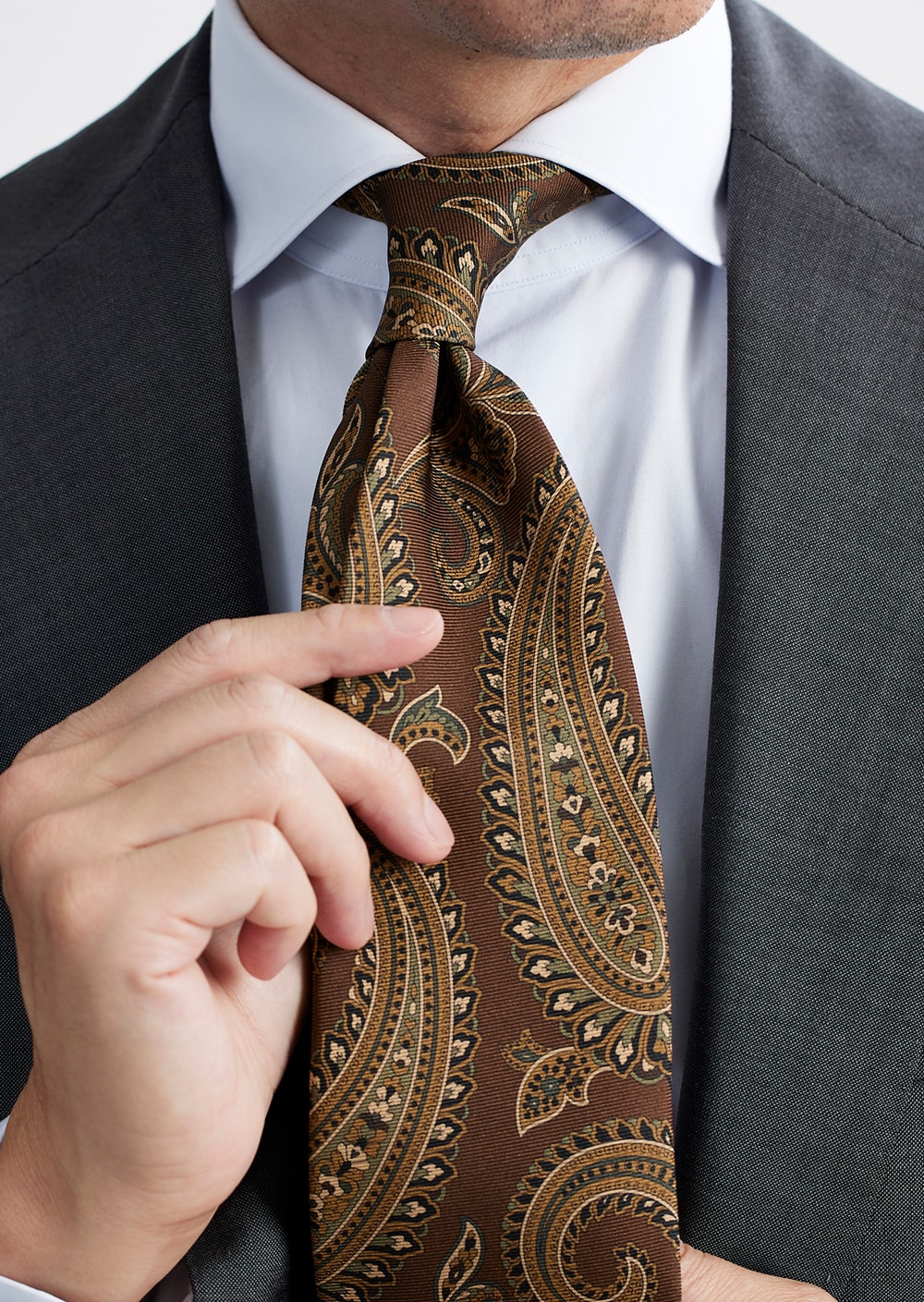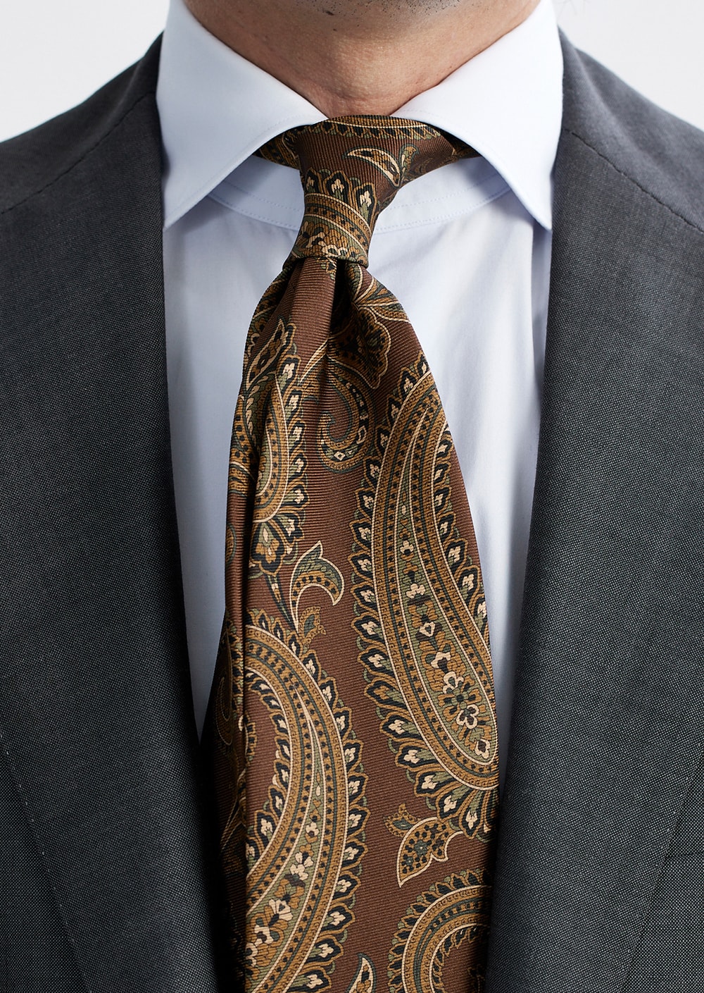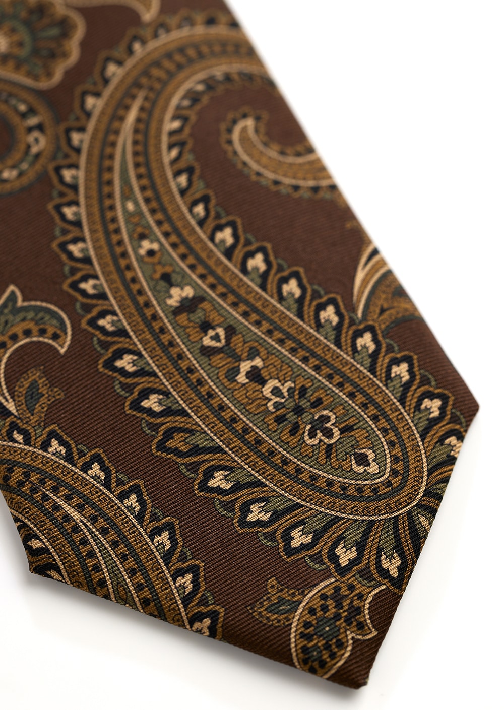 絶妙な配色で仕上げられた完成度の高い大柄ペイズリー。 手持ち感はカサっとした特徴を感じるドライタッチです。 伝統的なクラシックのスタイリングには欠かせないアースカラーの魅力をお楽しみください。
