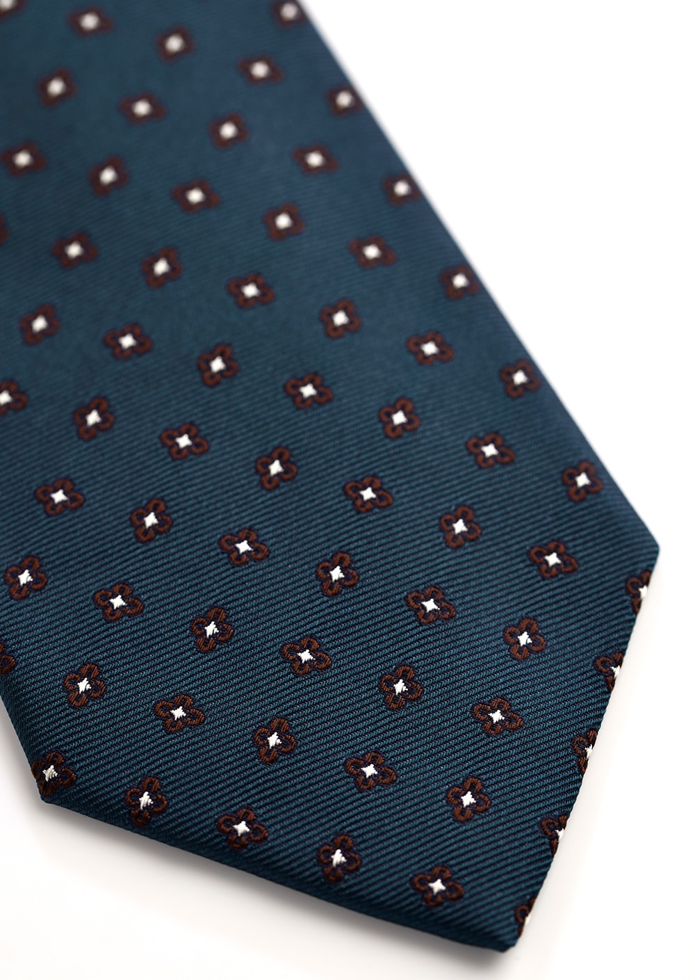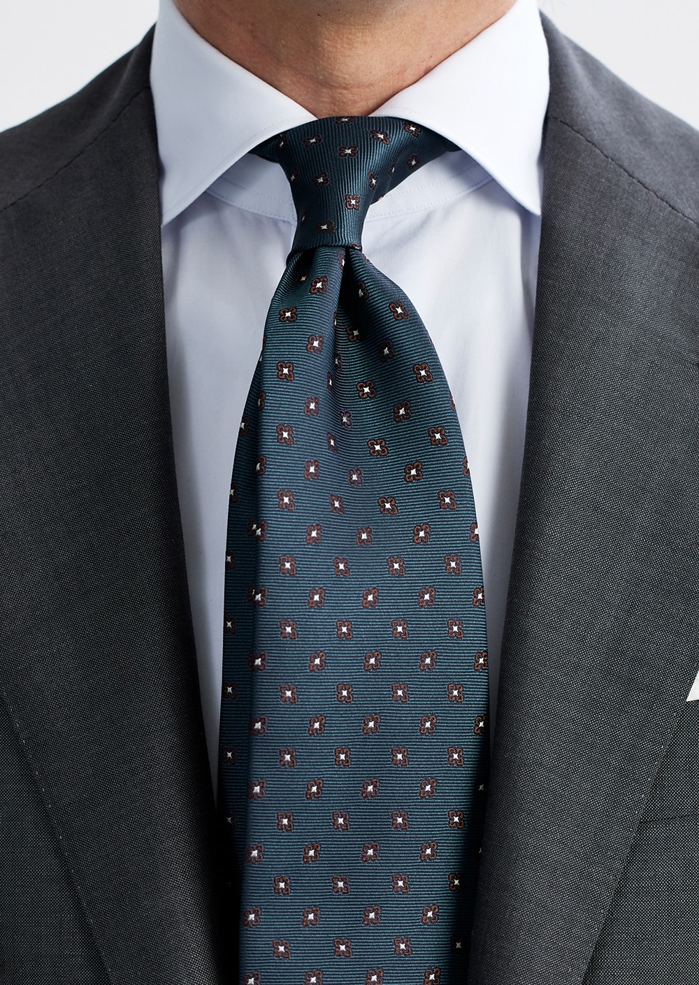 深みのあるインクグリーンはグレースーツ、ブラウンスーツとの相性が抜群です。 ベーシックな小紋柄ながら、ビジネスエグゼクティブに相応しい印象を与えるVゾーンが完成します。