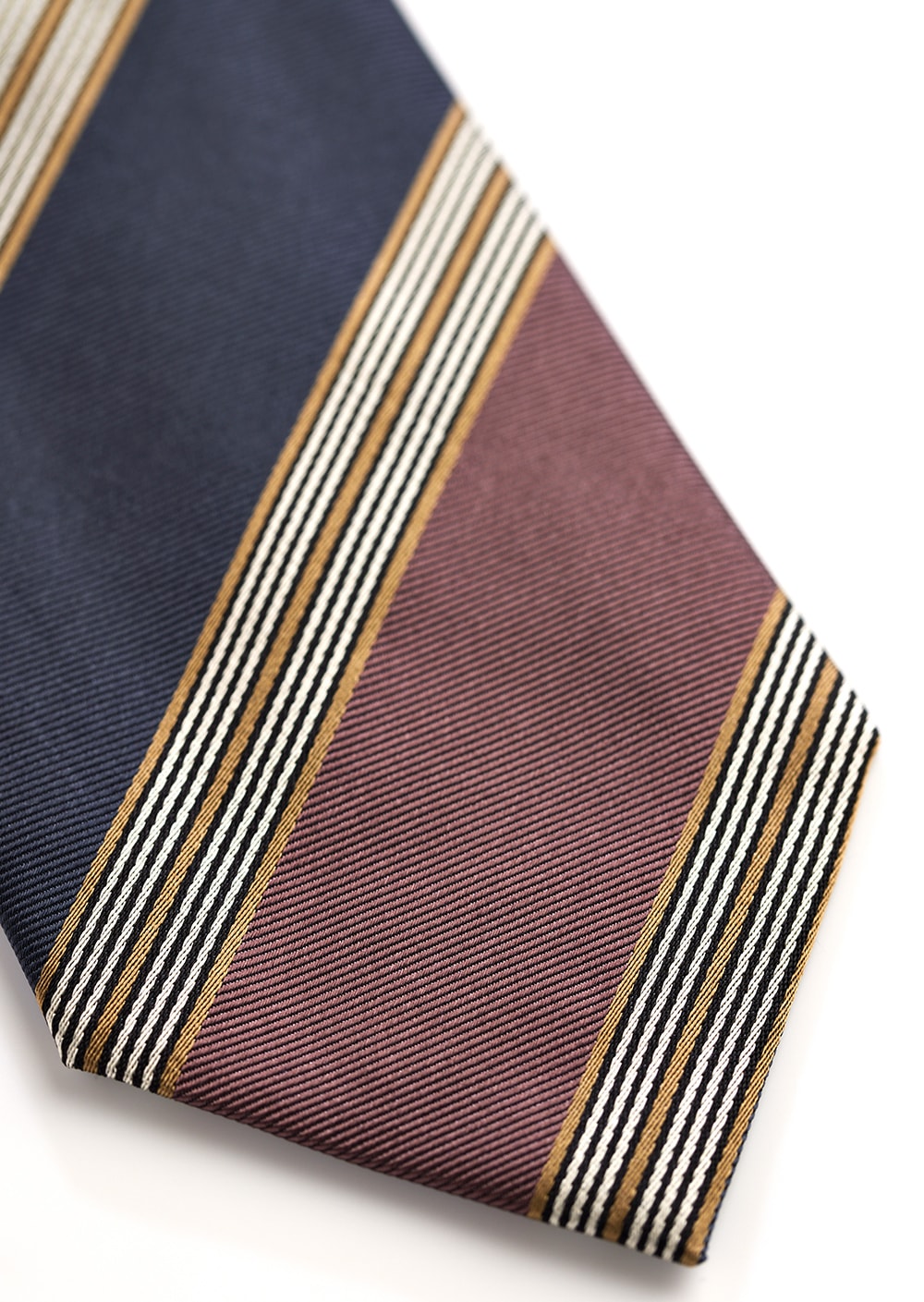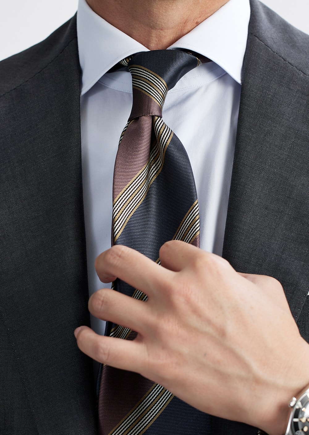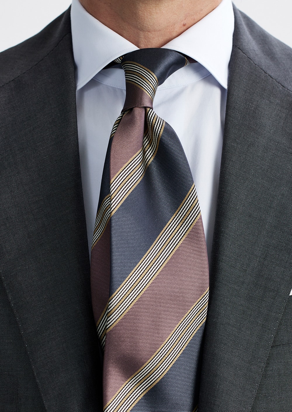 グレー x ピンクを基調に、シルバー、ゴールドの差し色で仕上げられた新作ストライプ。 ピンクの色味はスモークピンクでとても落ち着いた印象です。 若々しさ、高級感、両方を感じる最高にお洒落なネクタイです。