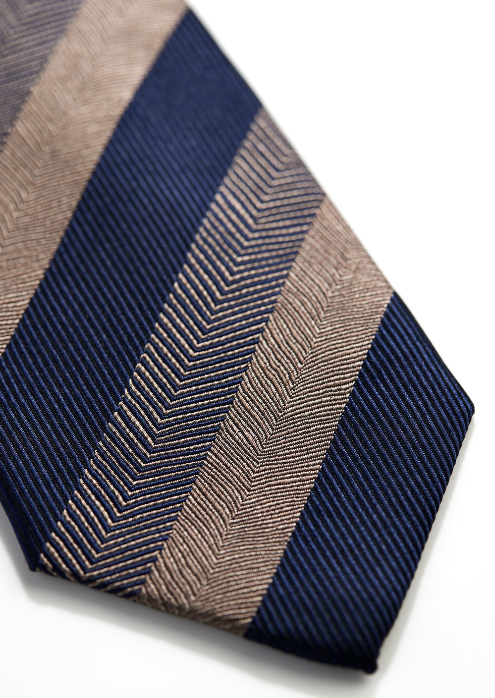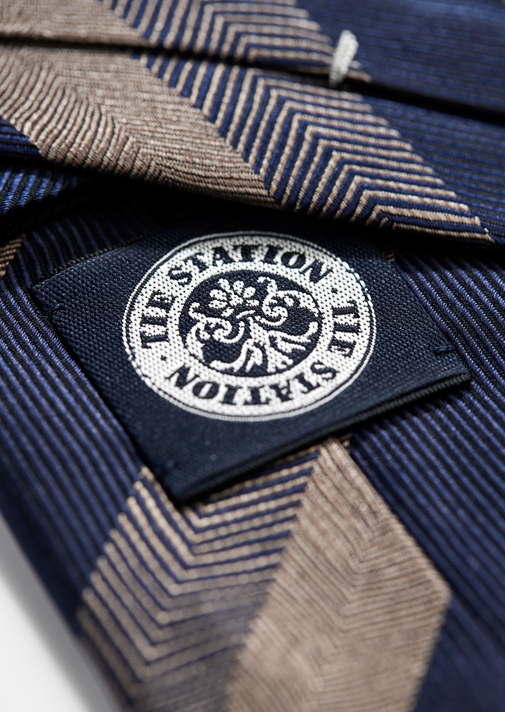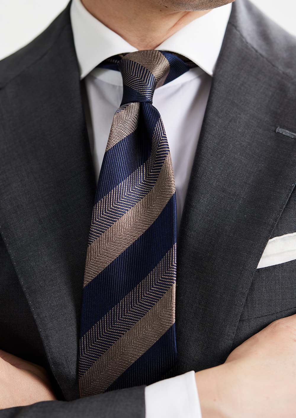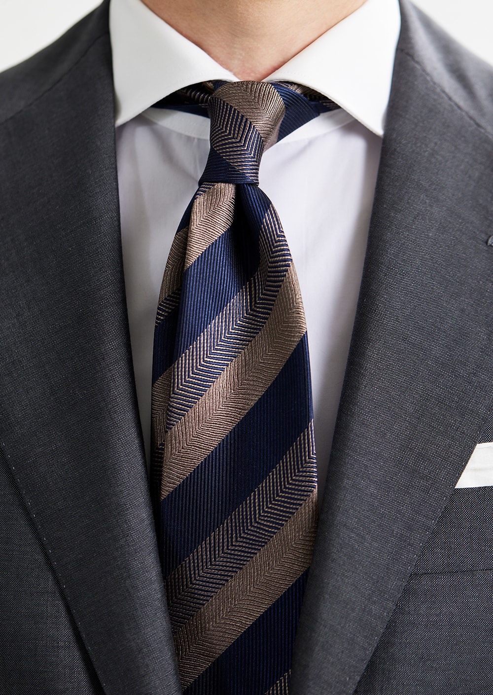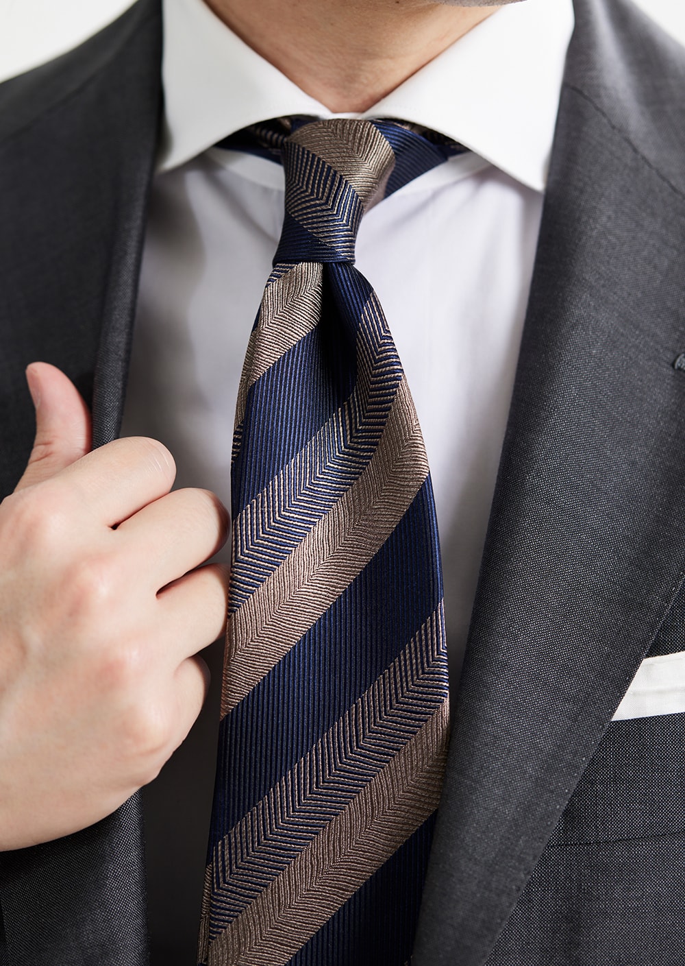 ネイビー x ブラウンで構成された新作ストライプ。 織り柄によるグラデーションの色変化が、シンプルながら奥行きを感じる完成度の高い生地デザイン。 最高にお洒落なネクタイです。