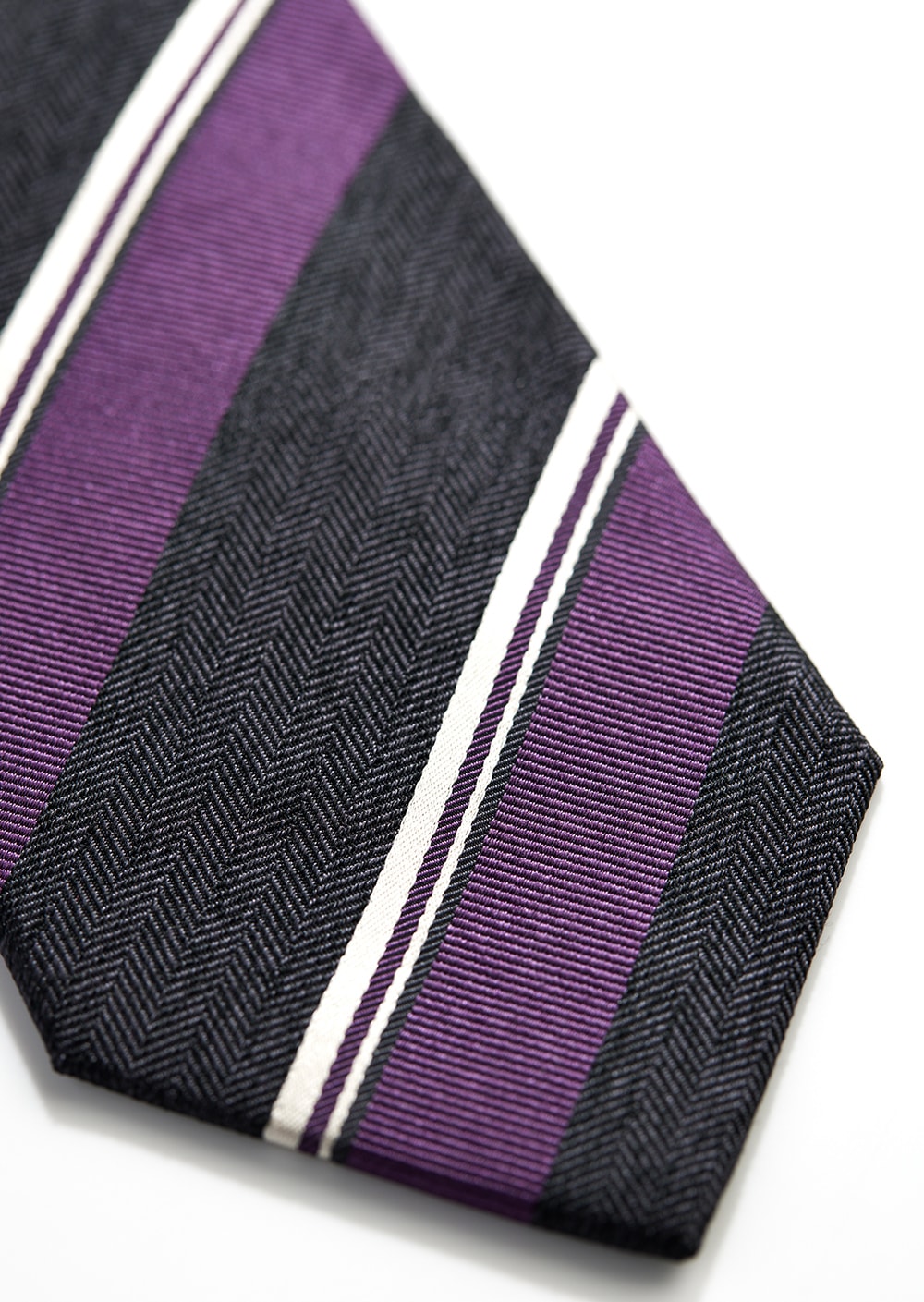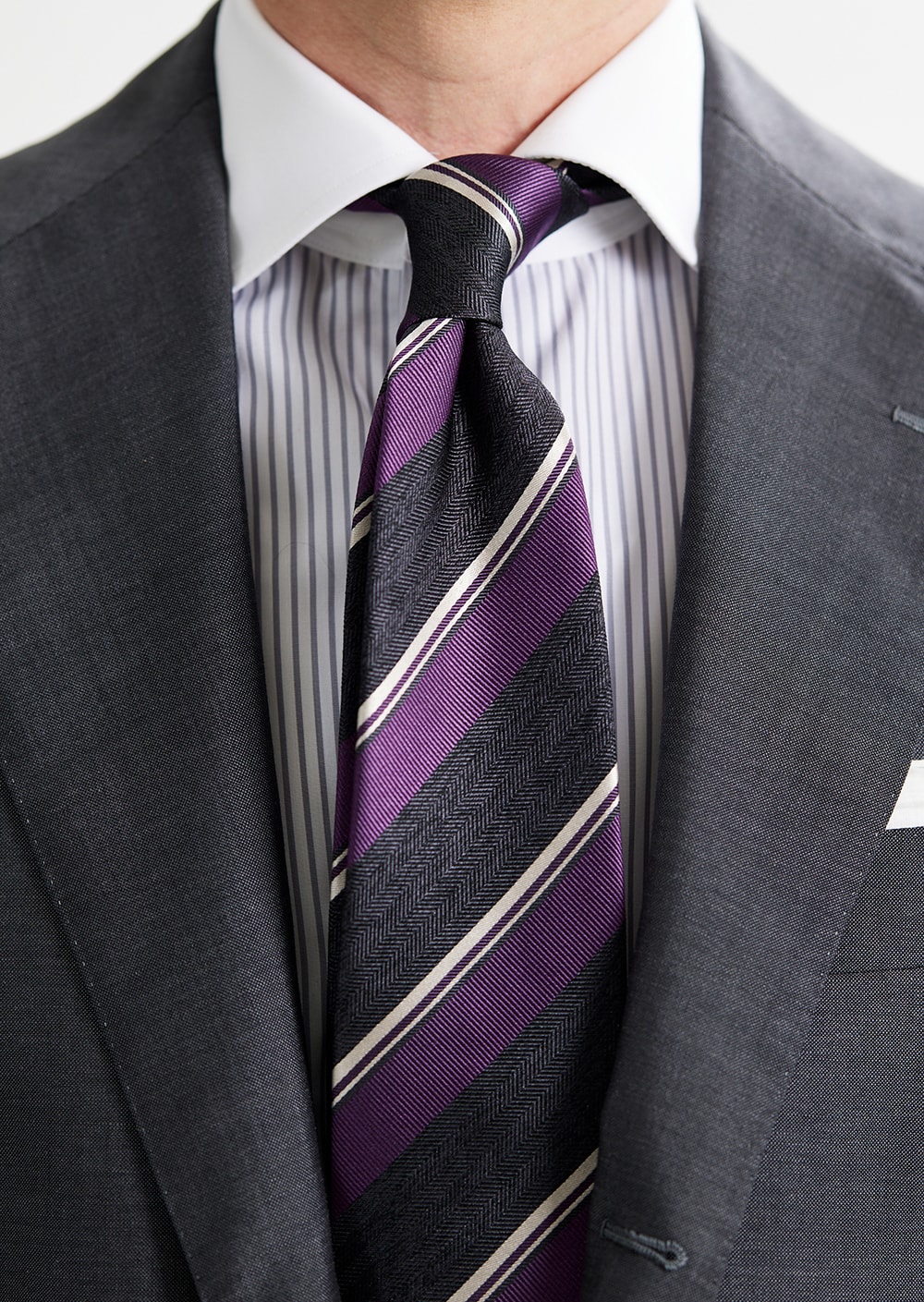 チャコールグレー x パープルの配色が新鮮な新作ストライプ。 織り柄もメランジの高級感のあるヘリンボーンと、鮮やかなパープルーはレップで仕上げられており、完成度の高さを感じます。 クールで印象的なVゾーンをお楽しみください。