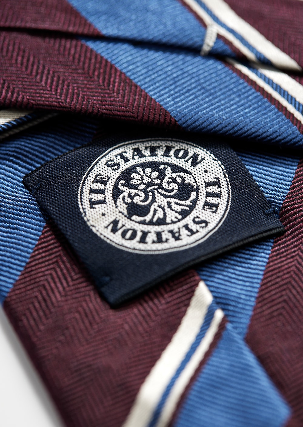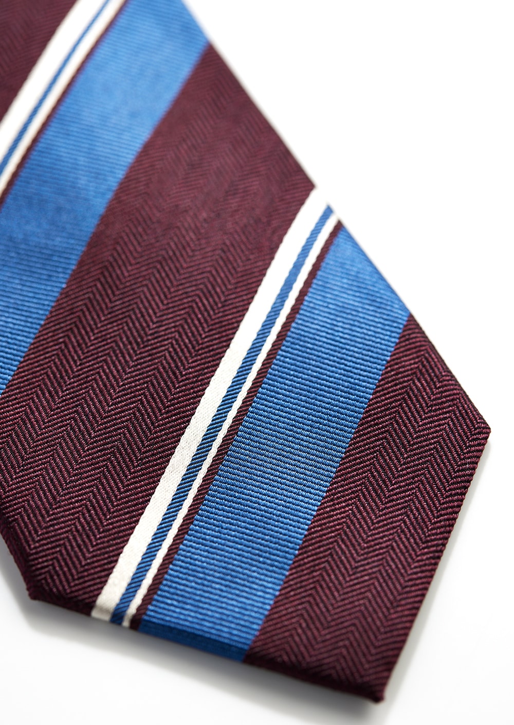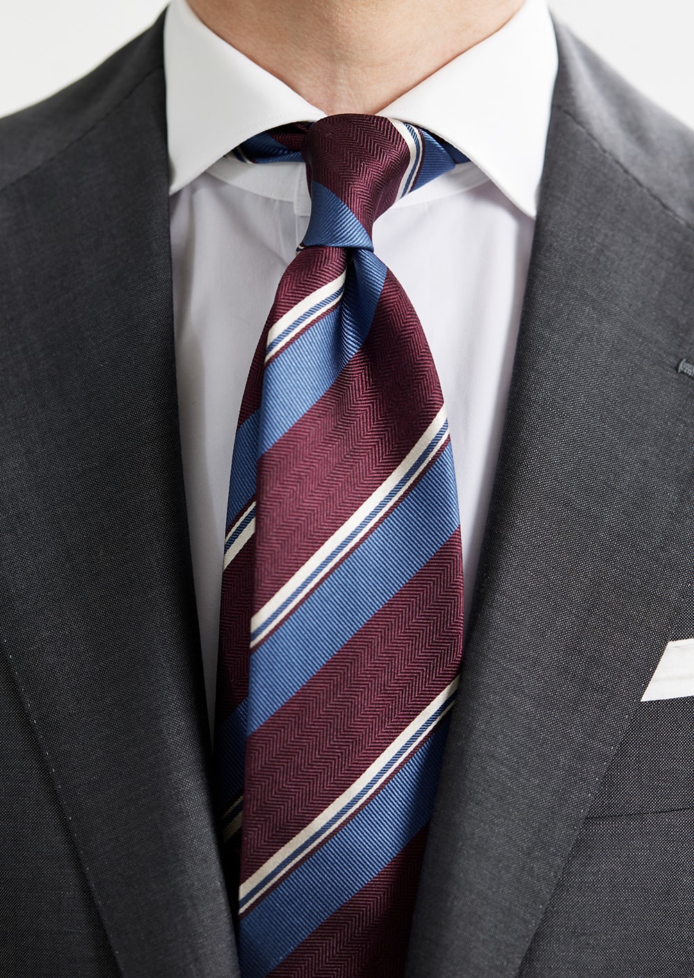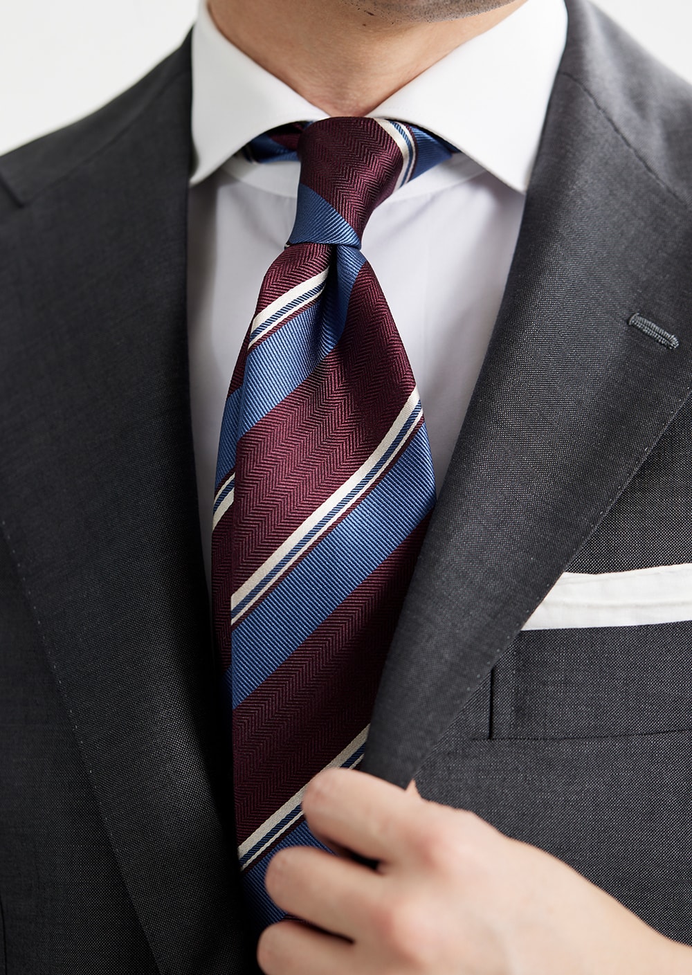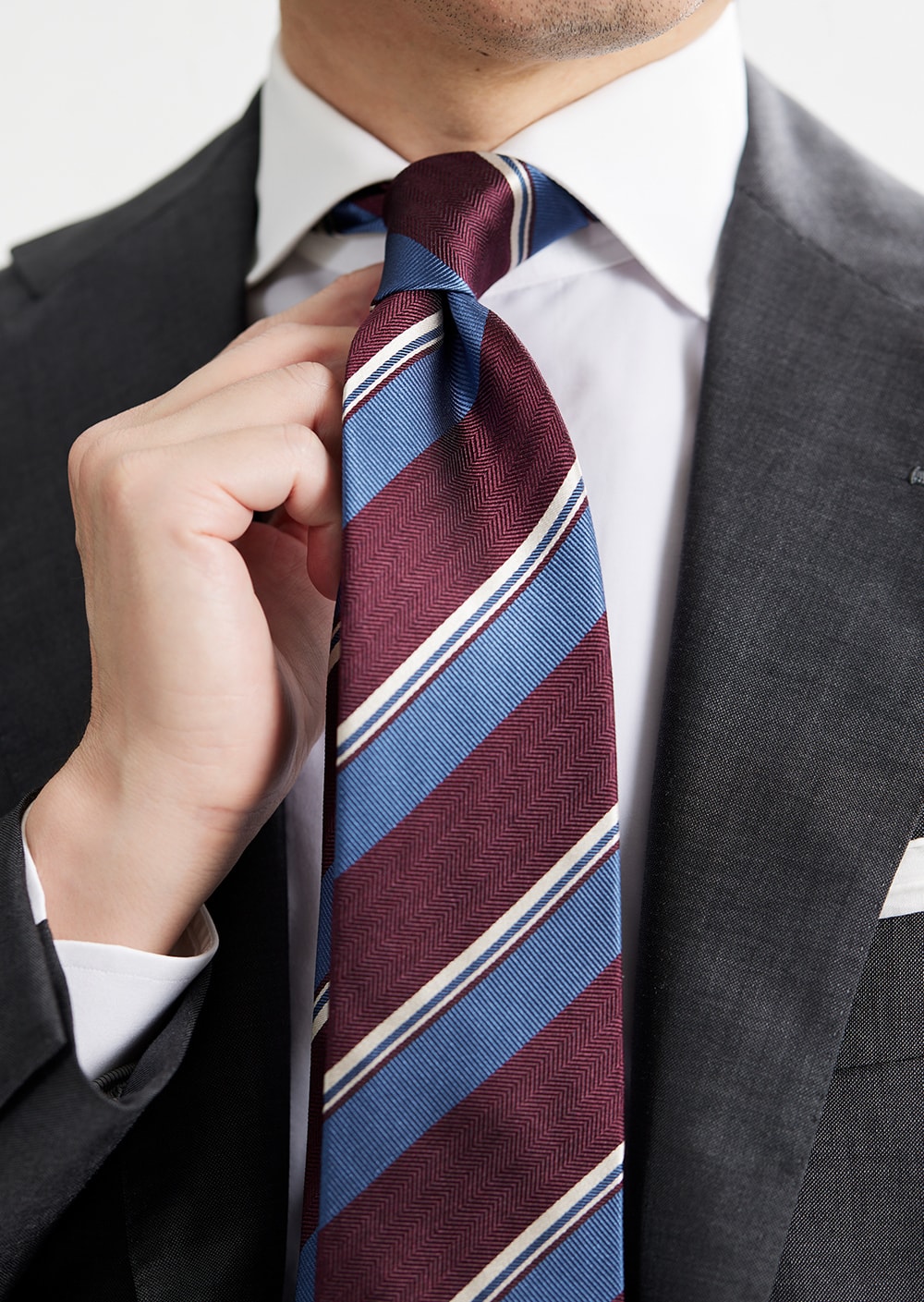 ワイン x ライトブルーの配色が新鮮な新作ストライプ。 よく見ると織り柄もワインはメランジの高級感のあるヘリンボーン、鮮やかなライトブルーはレップで仕上げられている完成度の高さ。 印象的なVゾーンを演出するのに最適なネクタイです。
