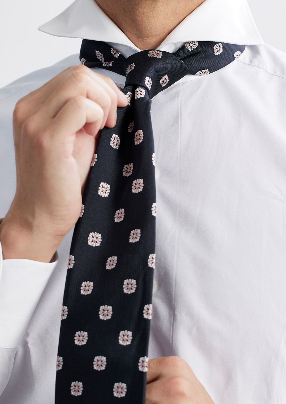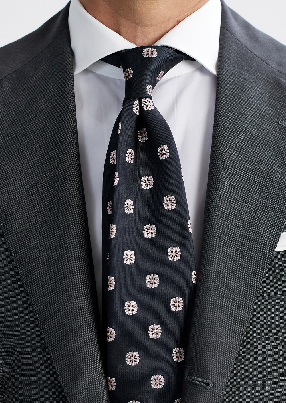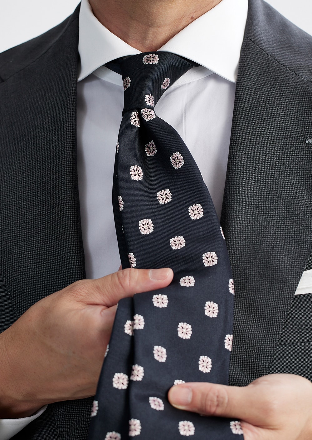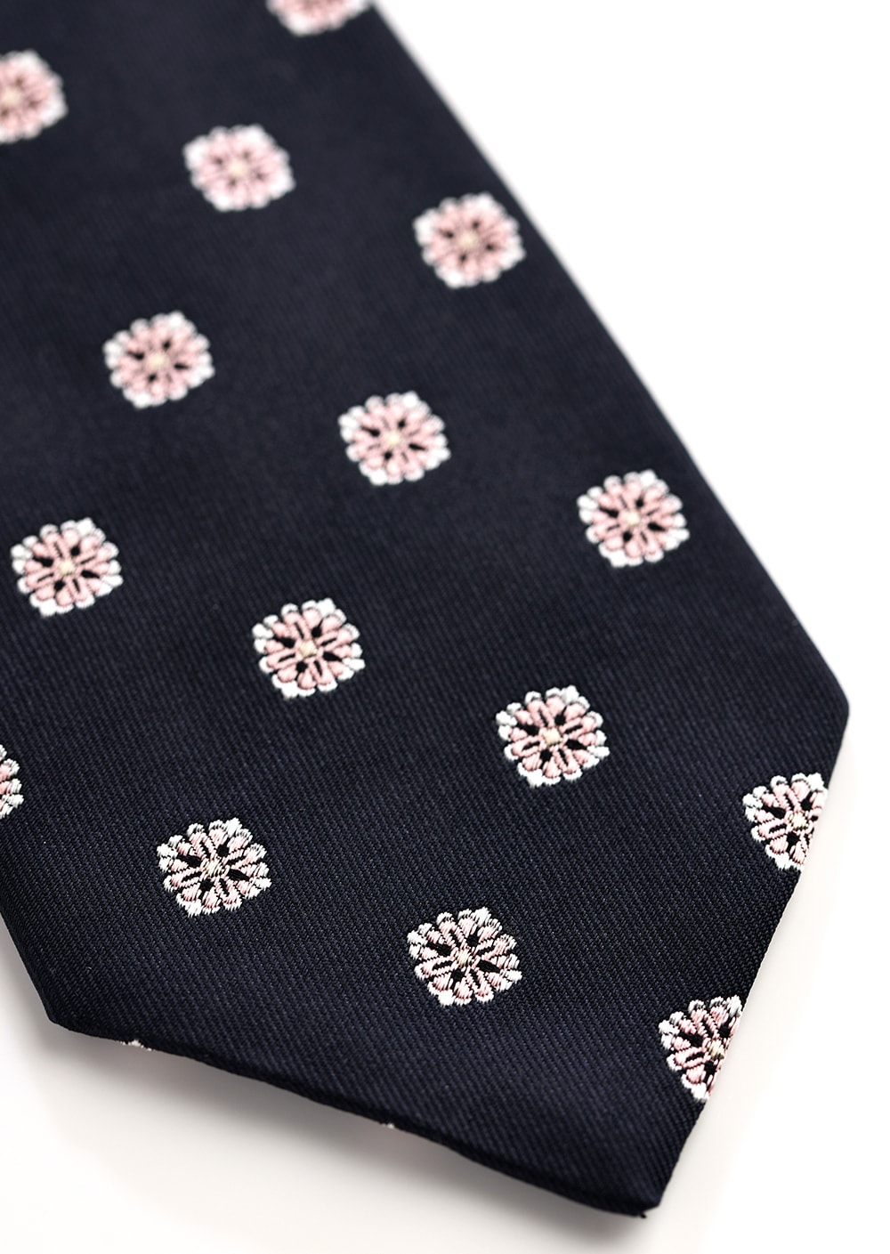 深いダークネイビーに爽やかなピンク, シルバーの配色は小紋柄がとても美しく際立ちます。 打ち込みも非常に強く長く愛用いただくことが可能です。 イタリア生地ならではの魅力を感じるとても美しい小紋柄です。