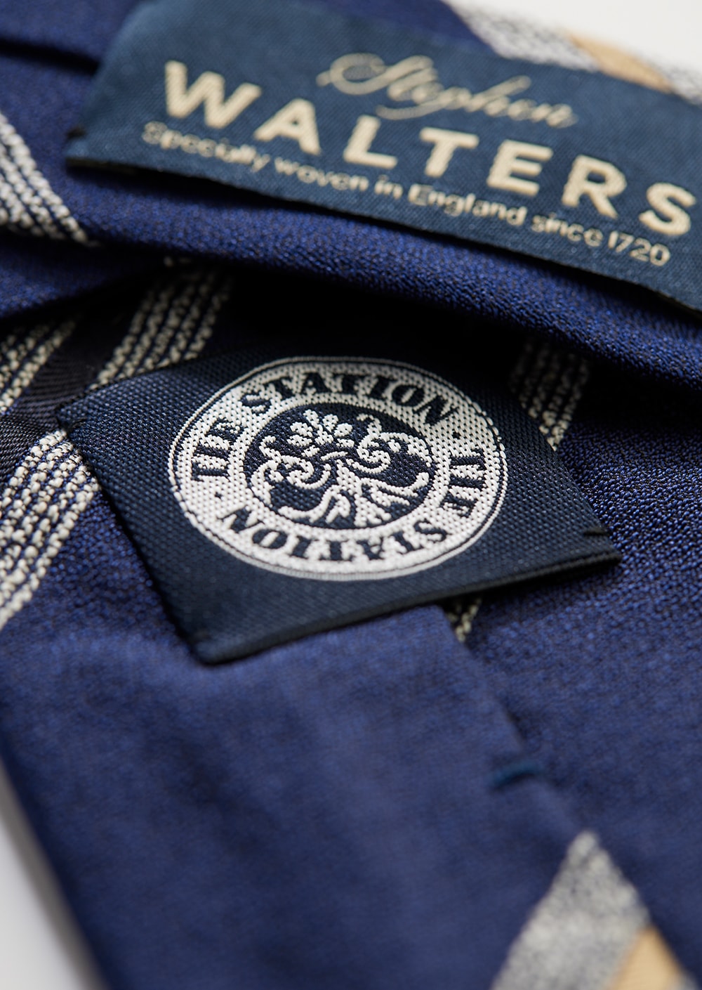 英国の名門STEPHEN WALTERSで仕上げたスペシャルコレクション。 高級感のある特別な織組織。 鮮やかなブルーにキリッと配されたストライプがなんとも絶妙です。 最高にお洒落な1本です。