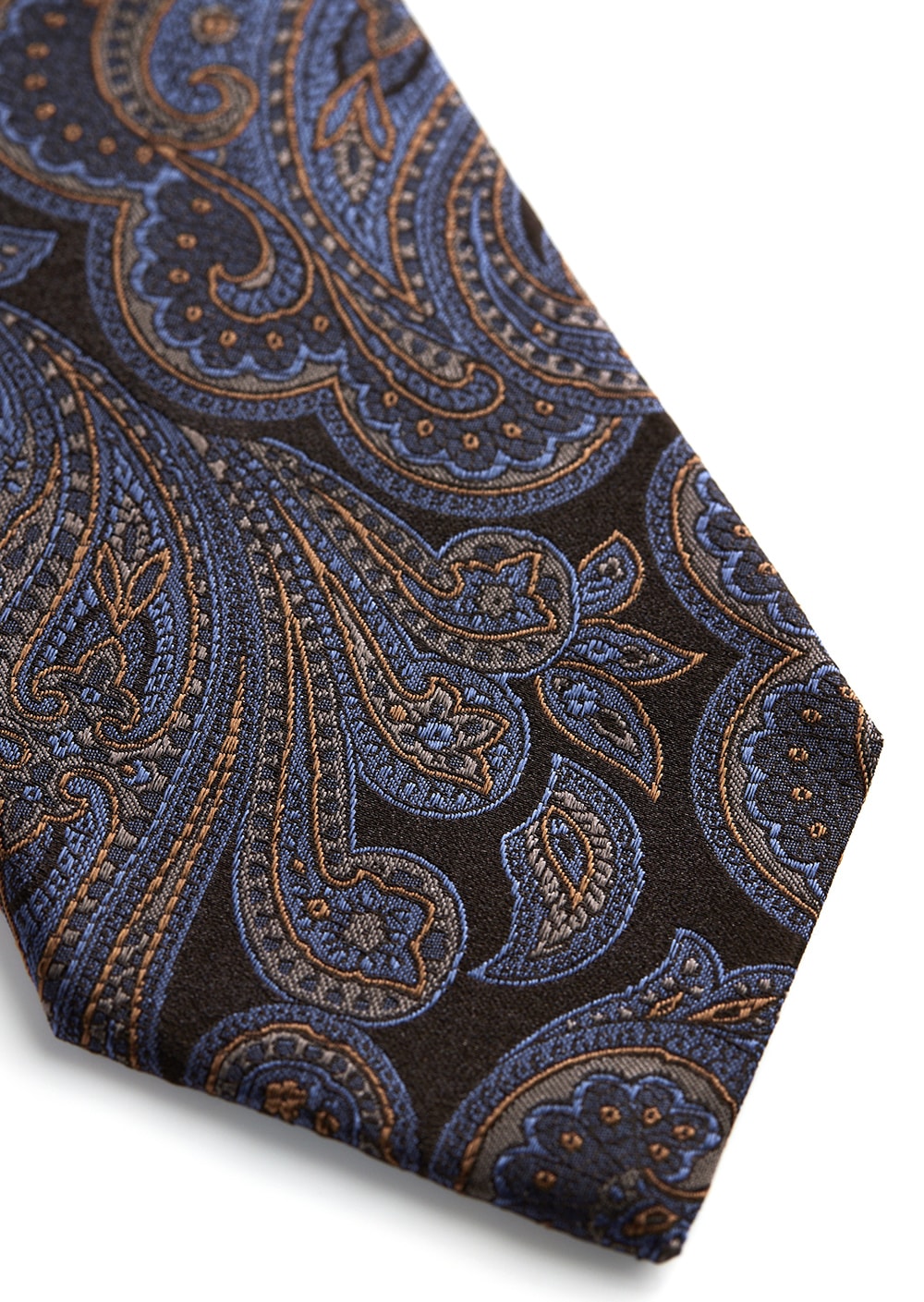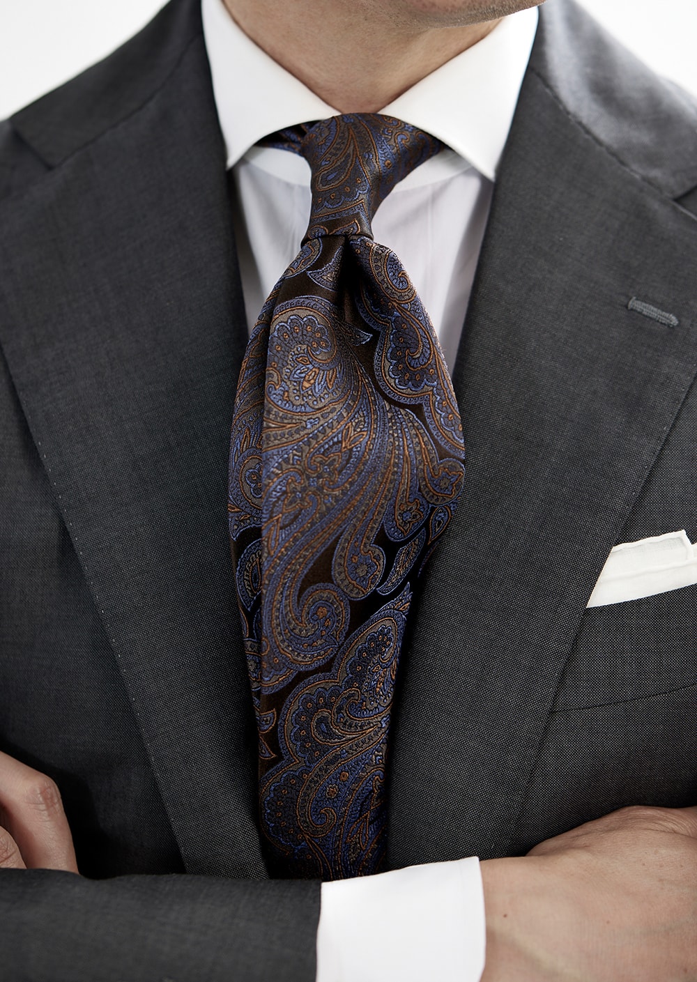 ブラウンを基調にサックスとベージュの配色で仕上げた新作ペイズリーが登場です。 Vゾーンの柄の見え方と、ジャケットのボタンを開けた時の柄の見え方で変化が出るぐらいの大柄ですが不思議と纏まりを感じます。 イタリア生地ならではの魅力、大胆さを感じる魅力的なネクタイです。
