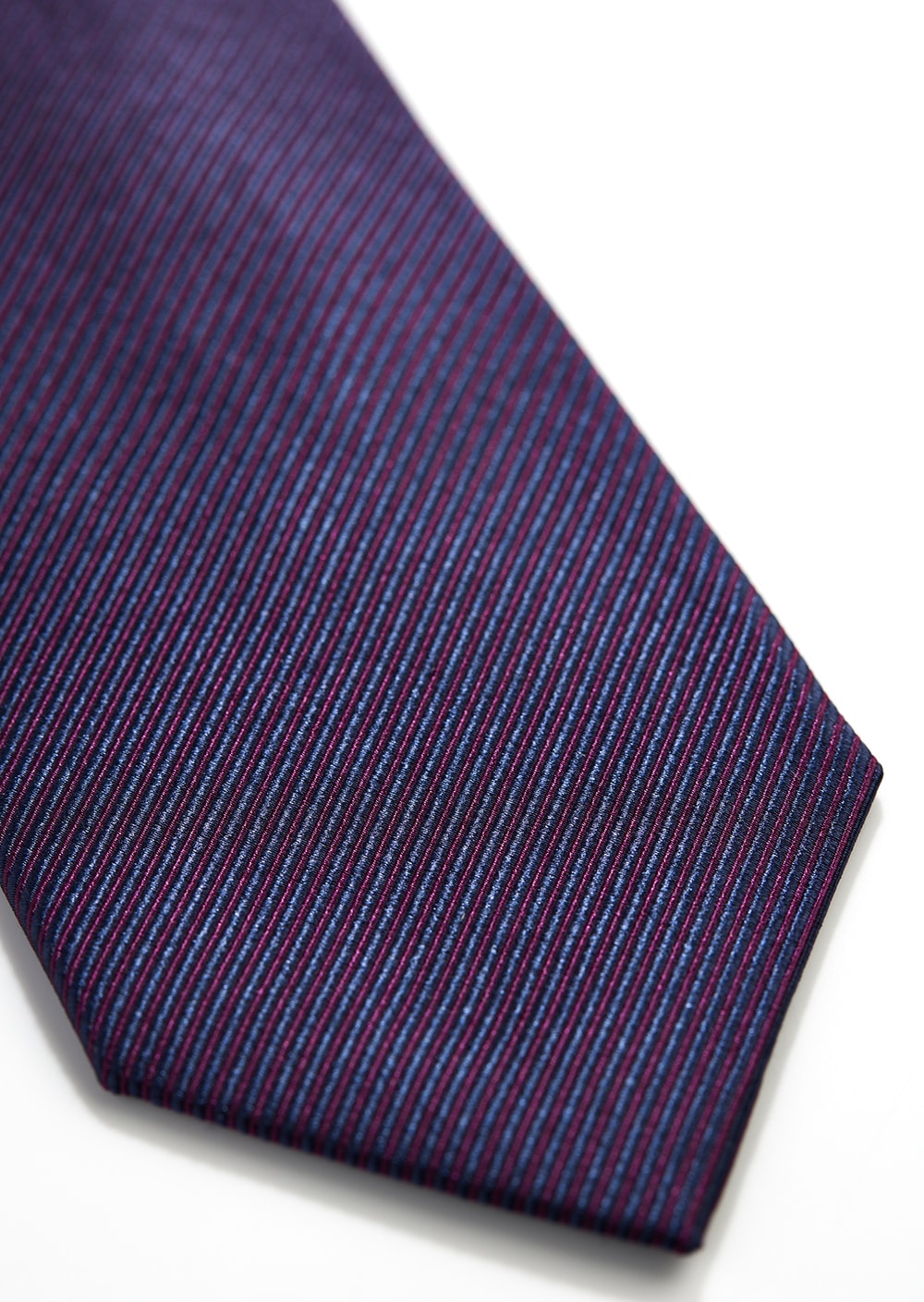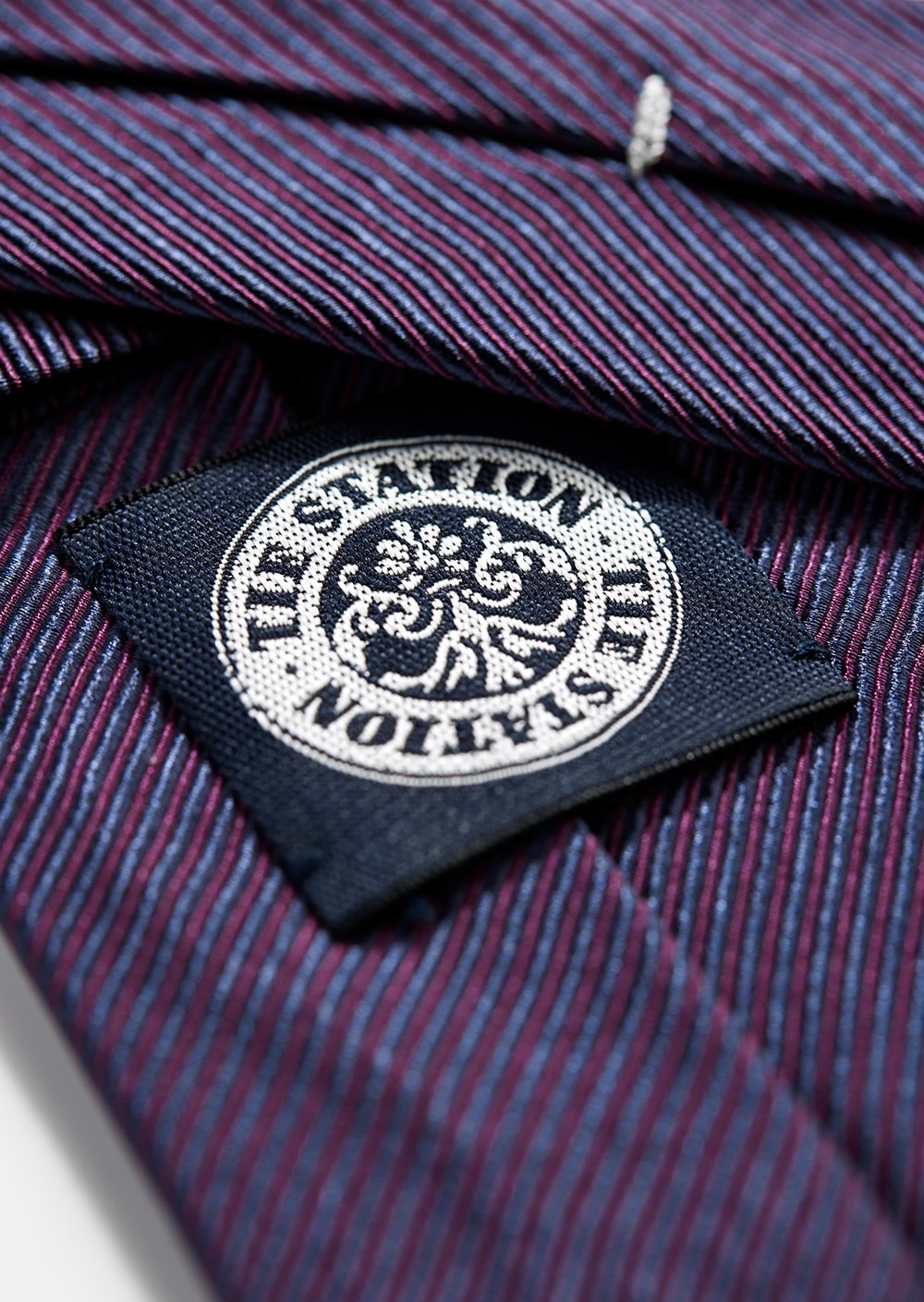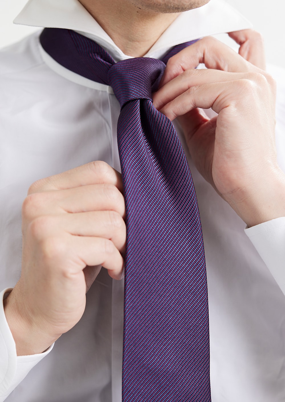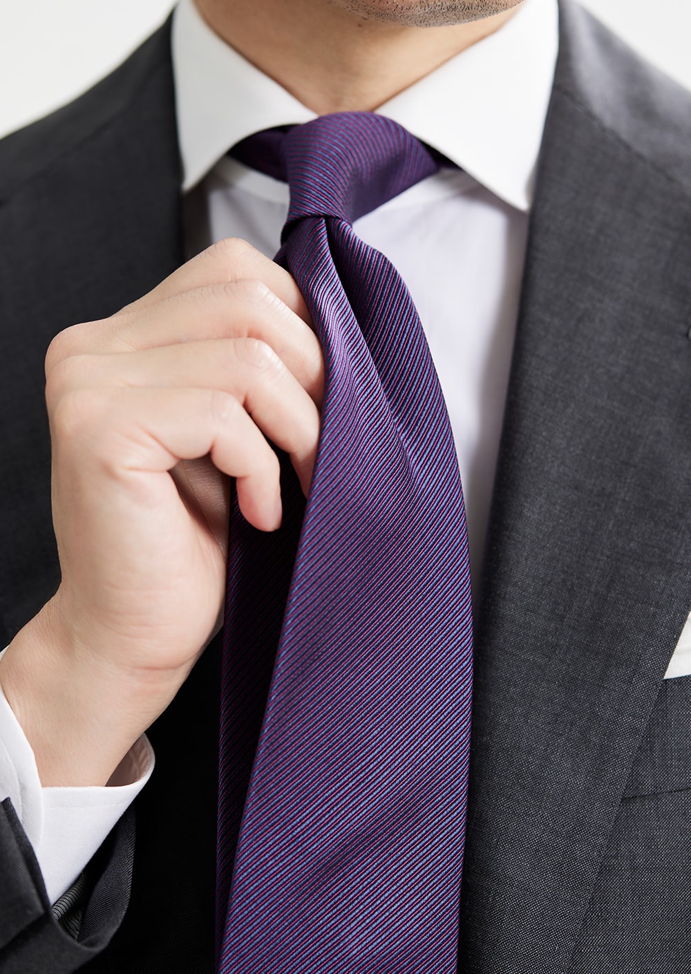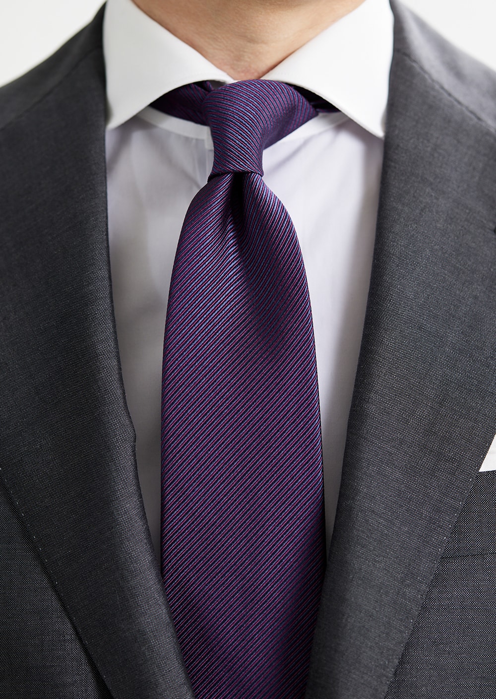 キリッとしたレップ、大人な印象の色味からは高級感を感じます。 黒靴とのシックなコーディネートでネクタイの魅力が一層際立ちます。 一見はソリッドですが奥行きを感じる完成度の高いネクタイです。